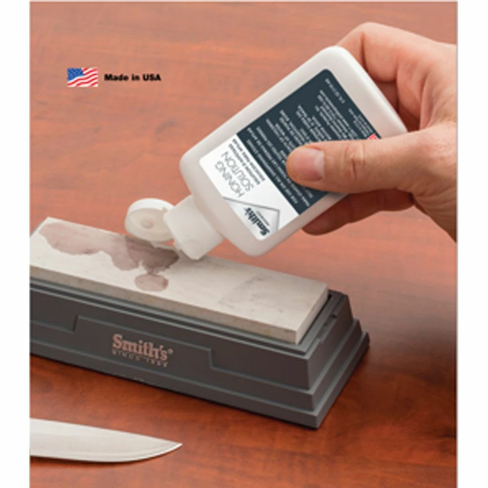 Smith’s specially formulated Honing Solution is nonpetroleum based and features built-in stone cleaning agents and rust/corrosion inhibitors. It is excellent for lubricating your Arkansas or Diamond Stone when sharpening. Never use an Arkansas Stone without some kind of lubricant, or you will clog the pores and cause it not to sharpen properly. Diamond Stones can be used dry, but we recommend that you use a lubricant for better performance.