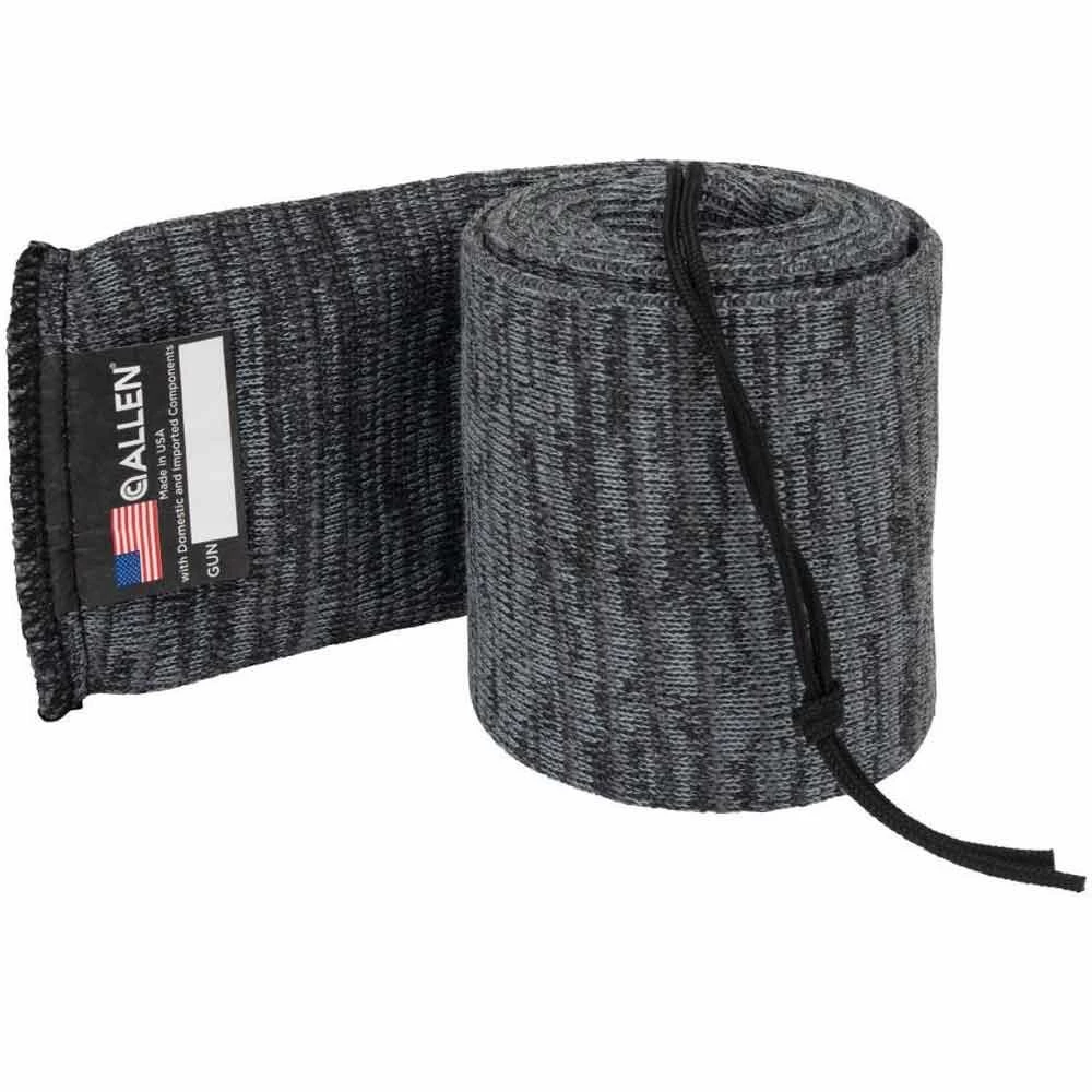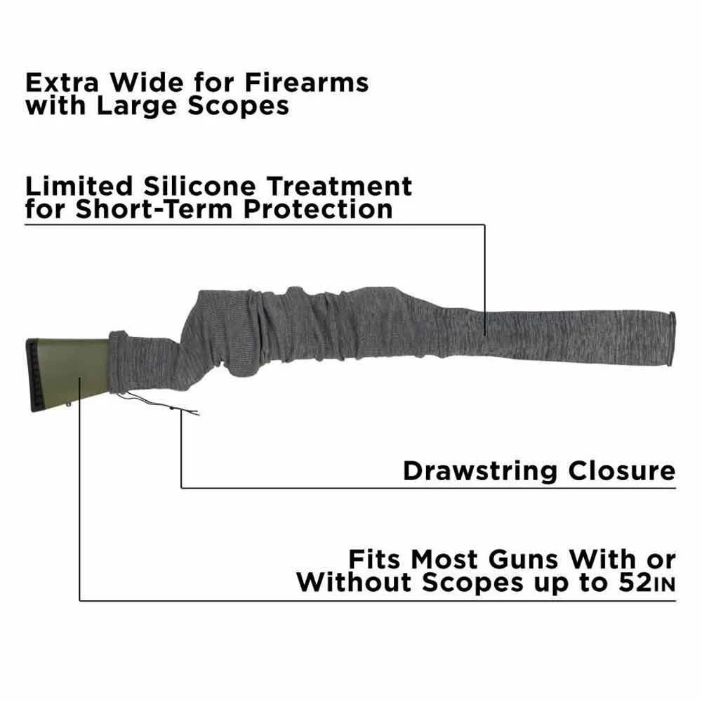 This Long Gun Sock by Allen comes in a black and gray color fabric and is extra wide for firearms with large scopes, including firearms with extra tall scope mounting. The Limited silicone treatment for short-term protection is designed to prevent your firearm from rust and debris, this gun sock also prevents dings and scratches when stored in your safe or hard case.