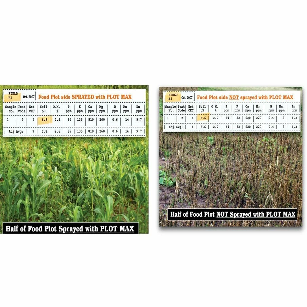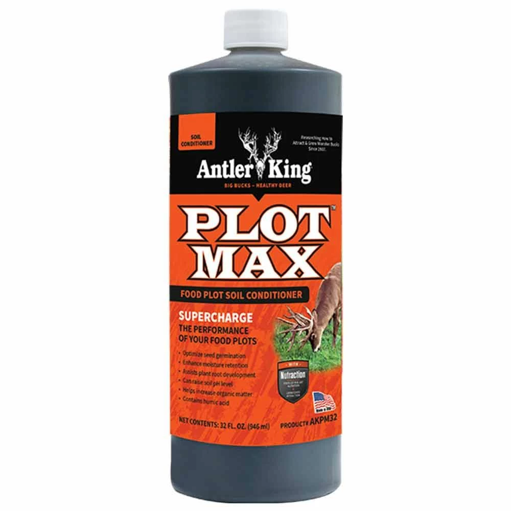 Antler King PLOT MAX may be the biggest and most revolutionary product to hit the food plot industry in a long time. PLOT MAX is a humic based, organic liquid carbon product that is mixed with water and sprayed on new or existing food plots. Food plots grown on soils sprayed with PLOT MAX are less subject to stress such as drought and are healthier which results in higher yields. The higher yields will mean more forage available for the deer and less over-browsing on smaller food plots! Lastly, PLOT MAX has shown to increase the pH level in the soil, which can improve fertilizer efficiency and the overall nutritional quality of food plots. PLOT MAX can be applied with most sprayers such as a backpack or ATV sprayer. Maximize your food plot performance this year with Antler King’s PLOT MAX. For best results apply in the spring and the fall on all new and existing food plots. It can increase available organic matter by almost 20% and the amount of minerals and nutrients in the soil by over 50%. May be mixed with contact weed killers such as Round-Up, so with one pass you can apply PLOT MAX and kill the weeds.