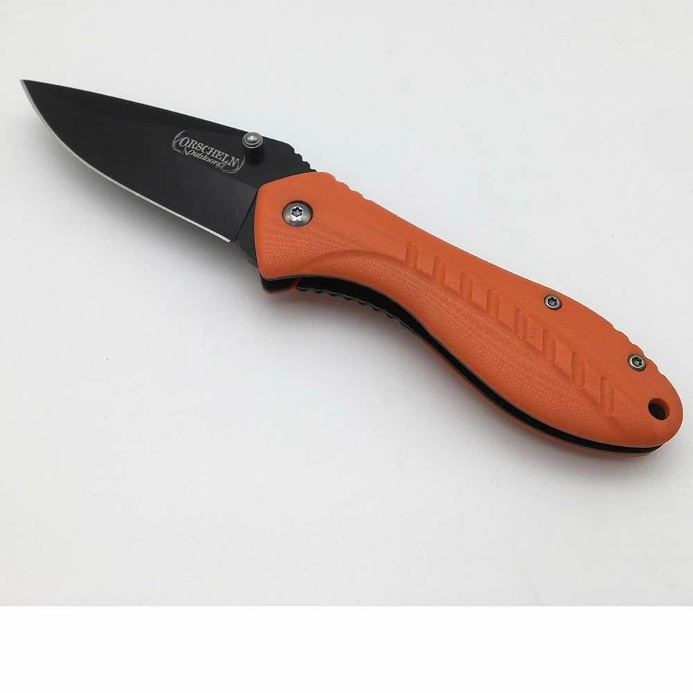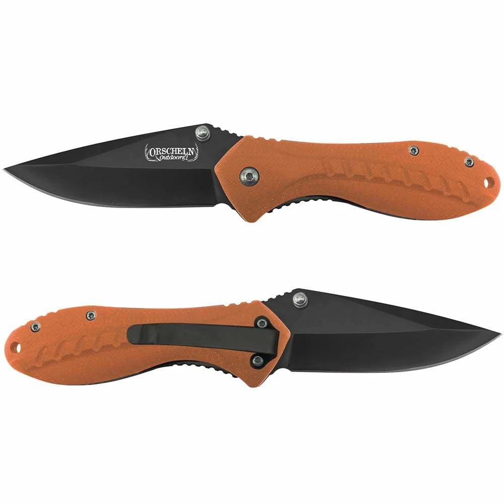 Orscheln Outdoors™ 3 in. Blackened drop point blade with ergonomic rounded handle and a thumb stud for easy opening. There is a liner-lock safety and a convenient belt clip.