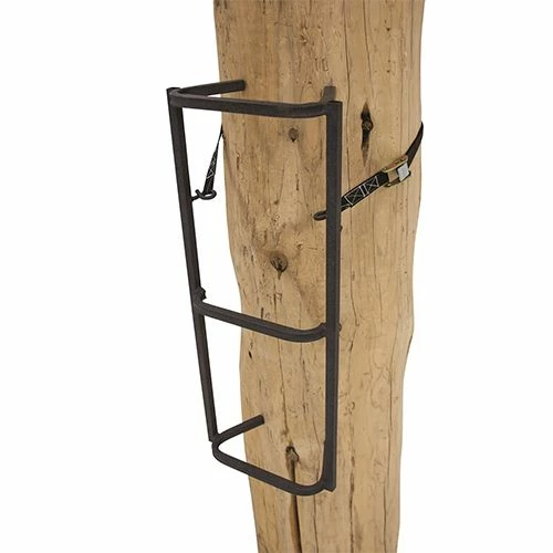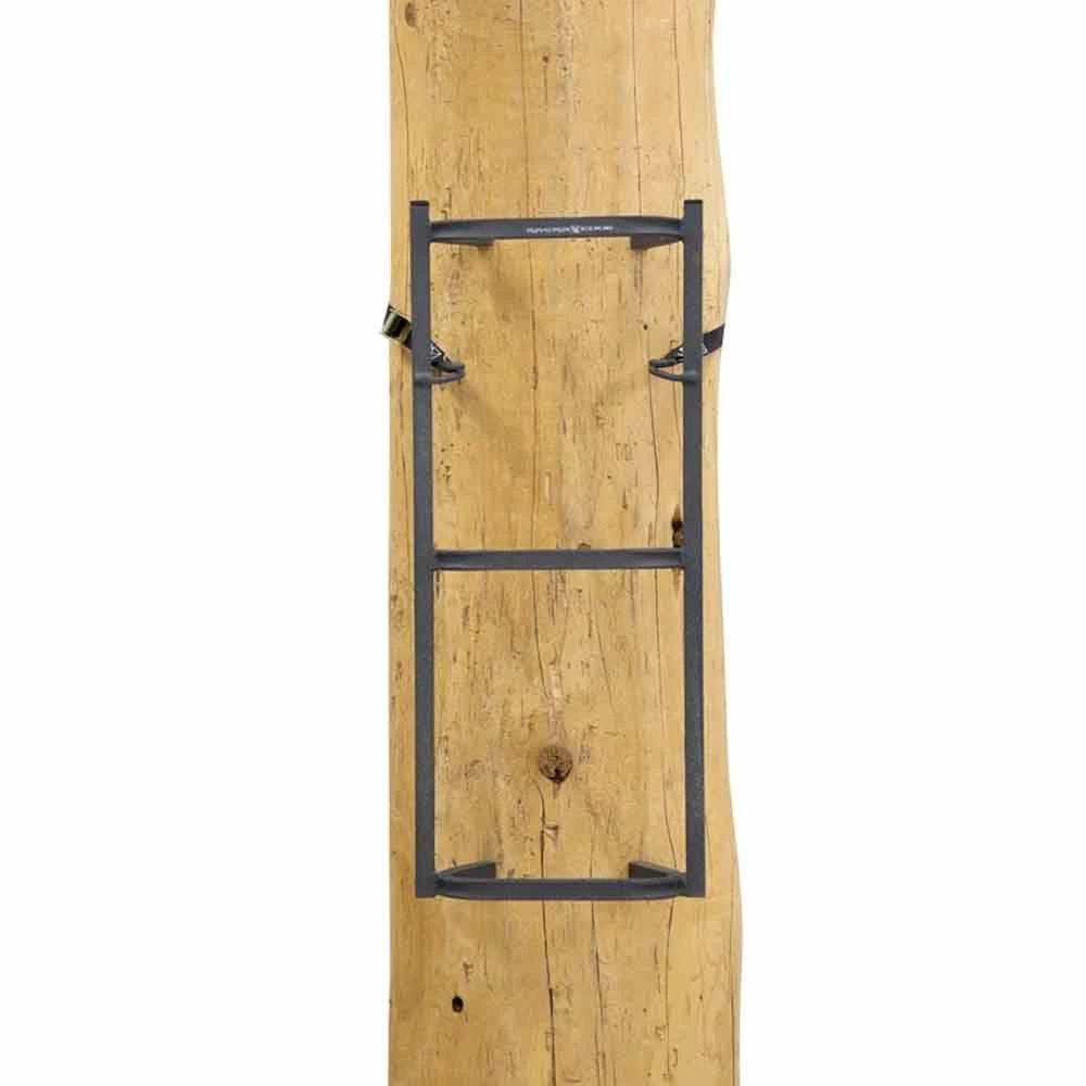 River's Edge Grip Rail Single is wide enough for two feet on every step, making it convenient for attaching your hang-on treestand. A full-length rail runs along each side, containing your feet for enhanced climbing. Each unit is fully-welded and features Tractionite non-slip coating. Silent RamHorn Attachment System – Looped strap fits over clever RamHorn shaped receiver for secure and silent attachment (no metal-on-metal contact to make noise like you'll find on other climbing systems). Individual sections attach independently allowing you to maneuver around obstacles or work your way around the tree. Sections nest together for compact, easy transport. No assembly and no bolted parts to shift, squeak or come apart.