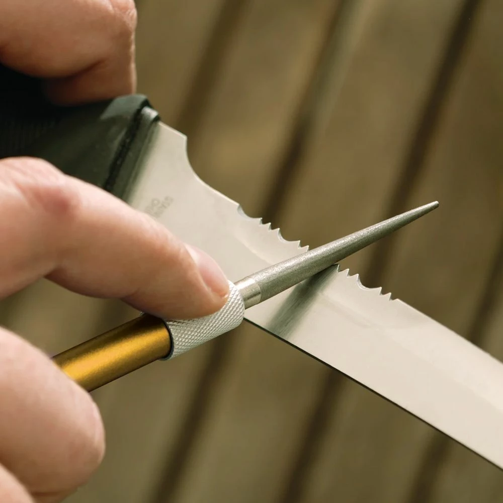 Smith's Diamond Retractable Sharpener features an unbreakable, diamond coated steel rod, which is specially designed to sharpen all types of knives, including serrated. Multiple layers of medium grit, monocrystallin diamonds makes sharpening quick and easy, while still giving you that razor sharp edge on your knives, tools, or hooks. The rod is reversible and can be adjusted to variable lengths. It has a sharpening groove for hooks and a shirt pocket slip for easy storage. The unit is light, compact, and durable.