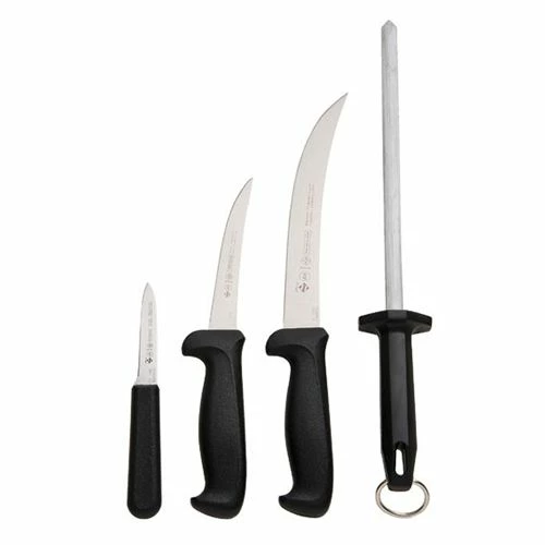 LEM? Mundial Hunter's Kit includes all the knives you need for processing your own deer. A 3-1/4 in. paring knife, 5 in. curved boning knife, 8 in. steak knife and a 10 in. sharpening steel. The only thing you need to supply is the meat and the table. This kit is professional quality. Made by Mundial.