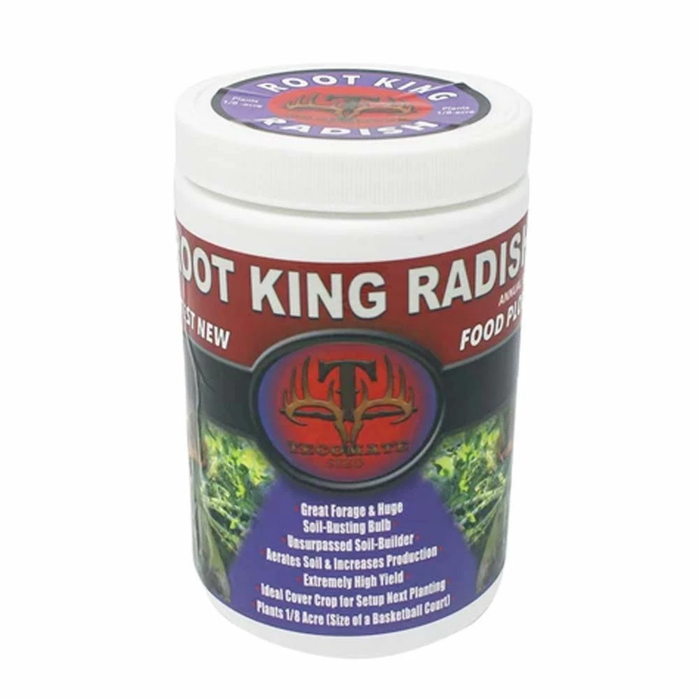 Tecomate Root King Radish Pounder contains a premium daikon radish that produces leafy forage plus a very large, soil-busting taproot that aerates the soil resulting in better water absorption, increased organic matter and greater root penetration. Along with an abundance of highly nutritious leafy tops, its giant bulbs provide excellent late season, high-sugar food deer love. The special coating improves growth and health of the plant and others around it. Extremely high yielding radish that is great as a standalone or mixed with other Tecomate® seeds.
