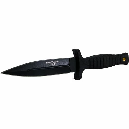 Smith & Wesson® H.R.T. Full Tank Spear Point Fixed Blade Knife is a black 7Cr17 high carbon stainless steel false edged spear point blade with blood groove, black rubber wrapped handle with lanyard hole. It has a black leather belt/boot sheath.