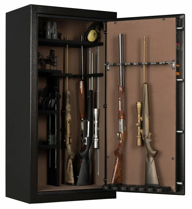 Browning Primal 23-Gun Safe with Electric Lock features a Duro Plus Interior that can be configured with half gun/half shelf or all gun. There are 7-1 in. 2 way bolts, 4 are active. The door frame is integrated and fully reinforced. The hinges are exterior and heavy duty. The 23 gun safe (8/16+7) Duo Plus has beige fabric and a 3-spoke handle.#html-body [data-pb-style="621604468CABE"]{justify-content: flex-start; display: flex; flex-direction: column; background-position: left top; background-size: cover; background-repeat: no-repeat; background-attachment: scroll; border-style: none; border-width: 1px; border-radius: 0px; margin: 0px 0px 10px; padding: 10px;}#html-body [data-pb-style="621604468CADE"]{border-style: none; border-width: 1px; border-radius: 0px; margin: 0px; padding: 0px;}