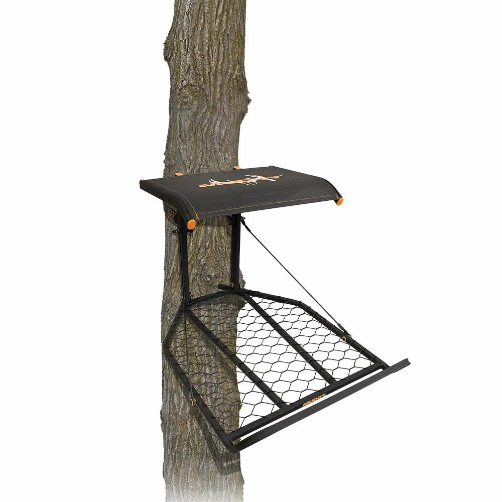 The Muddy Boss XL Hang-On Tree Stand is manufactured using steel construction and comfortable Flex-Tek seating that tips back for full platform use. The unit offers a wide stance platform with fixed footrest, silent straps…no metal on metal contact and Slicer Technology to maintain nose control.
