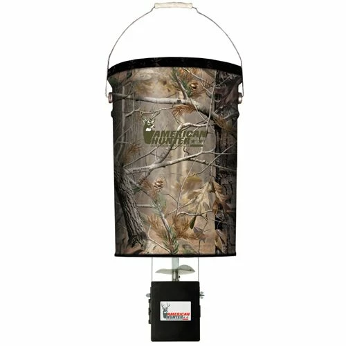 American Hunter Hanging Game Feeder is a 50 lb. capacity metal hopper feeder with Realtree AP Camo. It provides easy relocation. This feeder has an adjustable feed rate of 1-30 seconds, feeds at daylight and is programmable to feed 6 to 12 hours later.