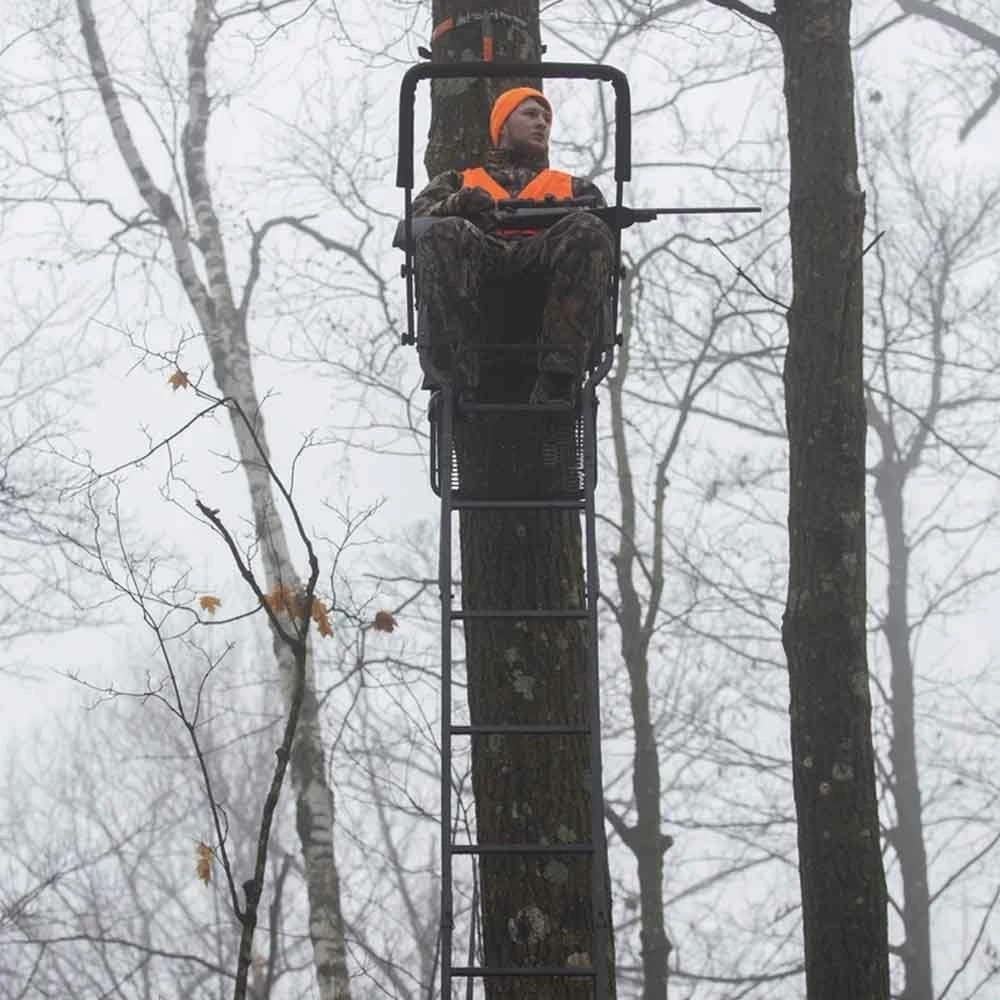 The Rivers Edge® Retreat™ ladder stand features a flip-up, TearTuff™ mesh seat paired with a 26 inch deep foot platform and flip-out footrest providing plenty of room for leg stretching or space to stand and shoot. The Retreat™ ladder stand has a 2-way adjustable shooting rail allowing you to set a height and depth that works for you. Make the Retreat™ ladder stand your top choice for your next hunt.