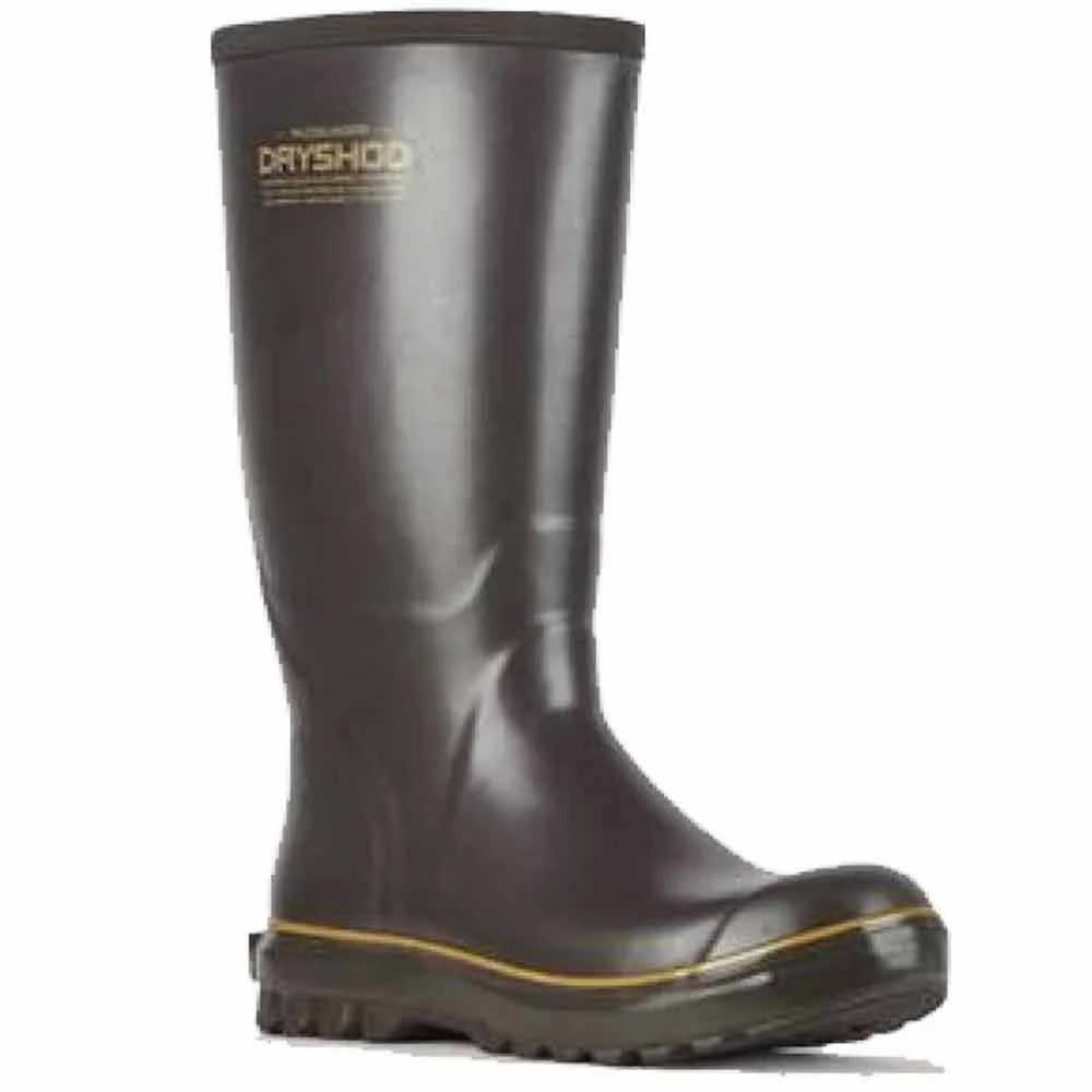 The Dryshod Mudslinger Hi Men's Farm Boot is a premium rubber farm boot with WIXIT Lining Waterproof protection from muddy, messy terrain and WIXIT Cool-Clad™ wicking airmesh lining for all-day comfort. The self-cleaning tread design resists build-up of mud, dirt, grit and gravel. There is a fully seam-sealed neoprene bootie construction with oil-resistant/slip-resistant rubber formula. Steel shank adds arch support and there is a rigid heel kick for easy on/off convenience.