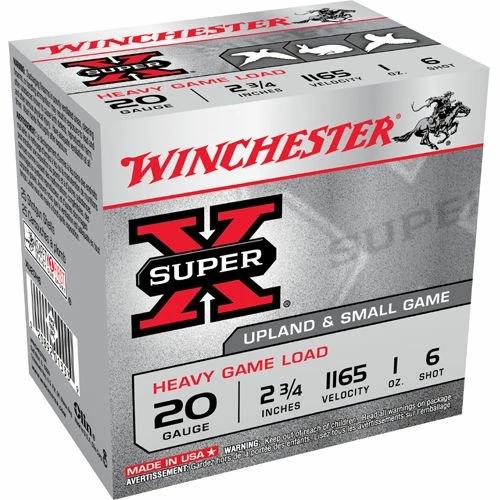 Winchester® Super-X Heavy Game Load 20 Ga. 6 Shot Ammunition uses a one-piece wad plus higher shot weights for consistent, tight patterns, and long-range knock-down. A heavy shot charge for more pellets on target with a 209 primer and clean burning powder for reliable ignition and consistent velocity. This ammo is used for upland and small game. Made in USA.