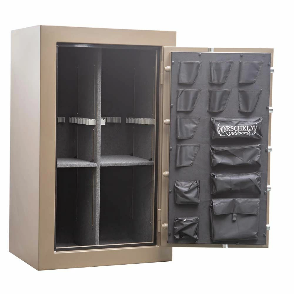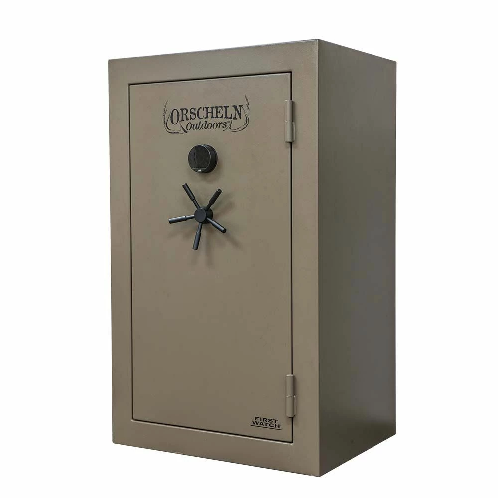 Orscheln Outdoors™ 44 Gun Safe is a fully carpeted lined interior gun safe with 6 adjustable shelves, 36 adjustable barrel rests and 11 scope rests. The door features 8 holsters for handguns, 4 medium storage pockets and 2 large storage pockets. It is 4 way locking with 7, 1-1/2 in. live action bolts and 4, 1-1/2 in. stationary bolts. This safe can be used with First Watch®. It can be quickly and easily set up with your safe, allowing you to customize the security and manage the device access. It also easily turns enhanced features on and off . First Watch® works with smartphones, user pin, keypad and e-key. There is a built in door sensor and ability for dual authentication using facial recognition, finger prints, pin code or pattern. First Watch® is available at the App Store and Google Play. Additional features include: Vacation mode (completely disable the access of your safe), Child Protect mode (Adds a layer of safety and security), 2-Step Authentication (requires 2 different unlock methods), and Spy Protection mods (allows the use of 2 random digits).