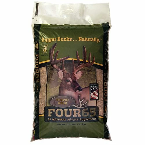 Trophy Rock Four65 Mineral Deer Supplement is a crushed version of Trophy Rock. There is nothing added and nothing removed, just 65 minerals for all four seasons. FOUR65 improves antler growth and over-all herd health. It also attracts and holds deer on your hunting property. It is a fantastic scouting tool when used in combination with trail cameras. It?s important to choose a secluded area for your FOUR65 sites so deer don?t feel nervous.FOUR65 will last longer if spread on high flat ground. Sandy mineral0stripped soils require more product while mineral-rich clay soils types typically require less. Pouring FOUR65 into a large pile without mixing it into the soil is another method that works. Don?t be alarmed after heavy rainstorms if your FOUR65 pile has vanished. All the trace minerals found in FOUR65 are still sitting there in the soil