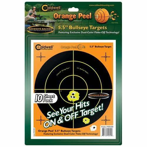 Caldwell Orange Peel 5.5 In. Bullseye Targets have a self-stick adhesive back that sticks to virtually any surface. These targets provide instant target feedback – you can see from the bench. It you hit the bulls-eye, it explodes in neon green. If you hit outsie the bulls-eye, it explodes in white.