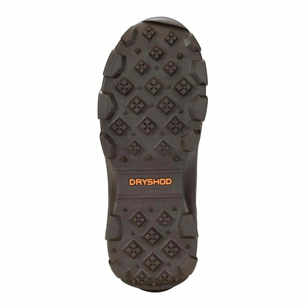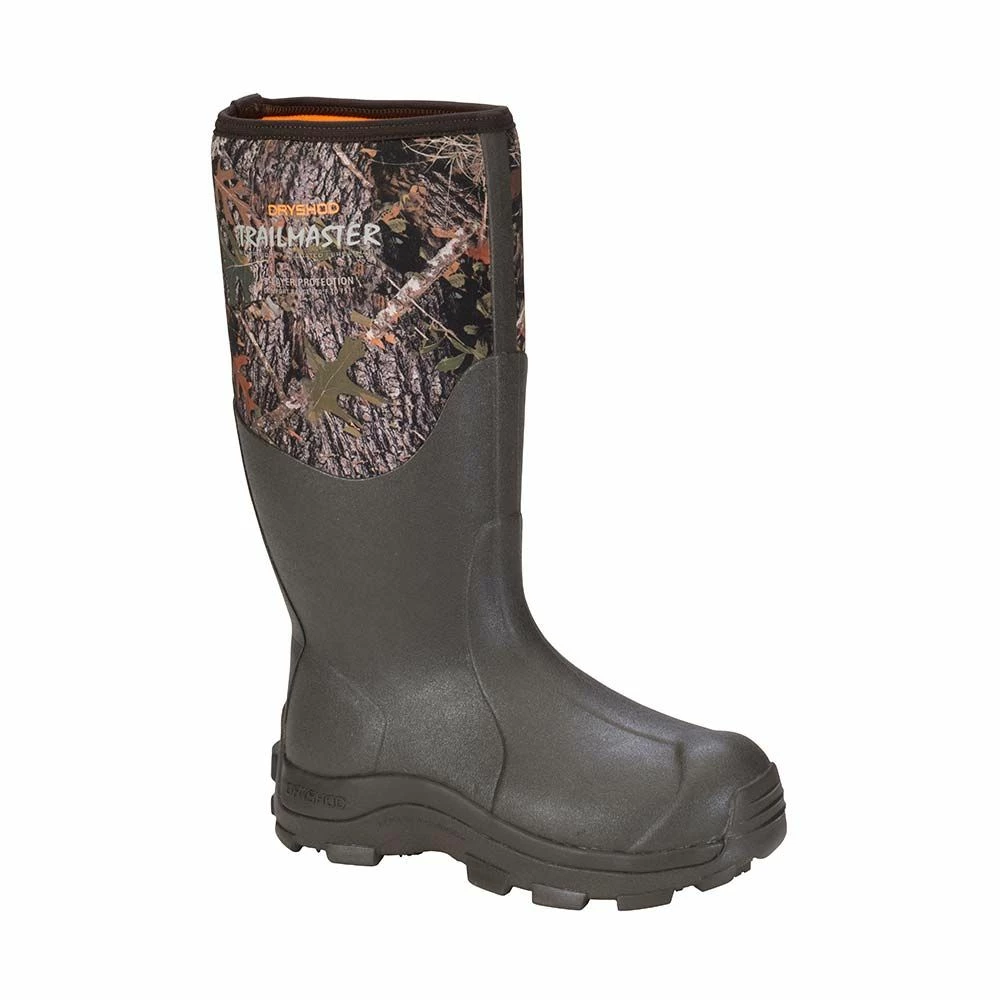 Dryshod Trailmaster Men's Hunting Boots are versatile hunting boots with superior traction for rugged terrain – fields, woods and stream! The Comfort Range or these boots is -20° to 75° F. They have 100% waterproof top to bottom, feature a 5mm Densoprene® Foam insulated bootie to keep out the cold & wet and keep in the warm & dry, along with Hydrokote® water repellent so water rolls off and dries in seconds. A 4-way stretch breathable airmesh lining to move the air and keep your feet dry and comfortable, roll-down calf pipe to tuck in your pant leg or vent in warm temperatures, only genuine hand-laid rubber (no PVC, PU or TPR), reinforced tuck board with rigid shanks for superior stability, slipper soft comfort and sized to athletic shoe standards, and convenient back-pull tabs for easy-on/easy-off convenience.