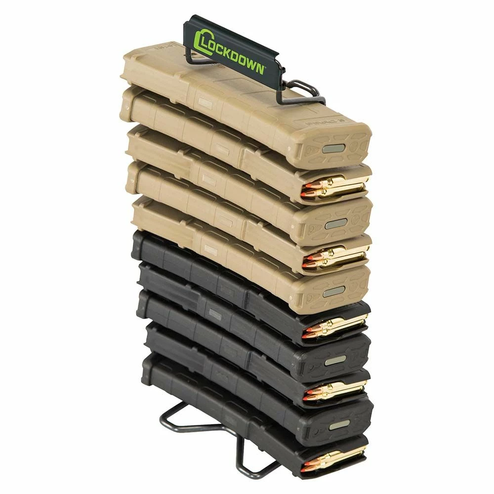 The Lockdown Magazine Rack is ideal for keeping AR-15 magazines organized. It conveniently holds up to 10 magazines either loaded or unloaded. It is designed to stand upright on a shelf or any flat surface or it can easily be mounted to a wall or vault door. It is compatible with both mil-spec and polymer mags. Holds any “in line” magazine from 10 round up to 30 round. The vinyl coated steel structure is durable and won't scratch or mar surface finishes.