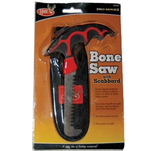 HME? Bone Saw with Scabbard is a T-shape bone saw with an easy-grip handle and super-sharp stainless steel blade easily cuts through the pelvic bone on deer or other large game. The end of the blade has a raised area to act as a stop. This will help keep the blade in the bone until it's completely cut.