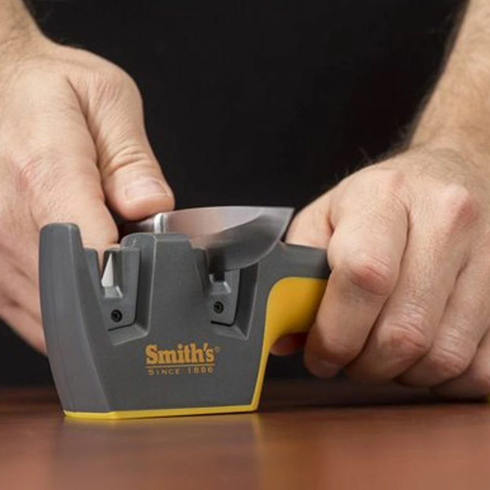Designed for the Sports Enthusiast who demands the highest quality sharpening tools and abrasives, the Edge Pro Pull-Thru Knife sharpener delivers a level of sharpening performance unmatched by standard edge care products. This sharpener offers two stages of sharpening for all types of knives, everything from everyday pocket knives to the finest customer sport knives. The precision ground carbides remove metal in a smoother, more consistent fashion when setting the edge on very dull straight edge blades, and the specially shaped ceramic stones can be used to lightly hone either STRAIGHT or SERRATED edge blades. It has an ergonomically designed soft grip handle and non-slip rubber feet for comfort and safety.