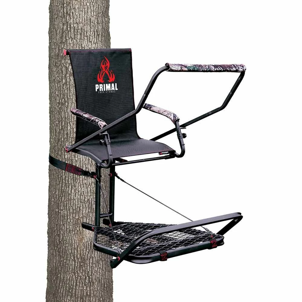 Hunt in comfort from the perfect spot you go with the Primal Treestands Comfort King Deluxe Steel Hang-On Stand. It features a spacious 20.5 x15.5 in. flip-up textilene seat with a full back rest. There is a 35.75 x 24 in. spacious foot platform that also includes a padded arm rests and an adjustable shooting rail as well as backpack straps for easy transport. The full body safety harness is included.