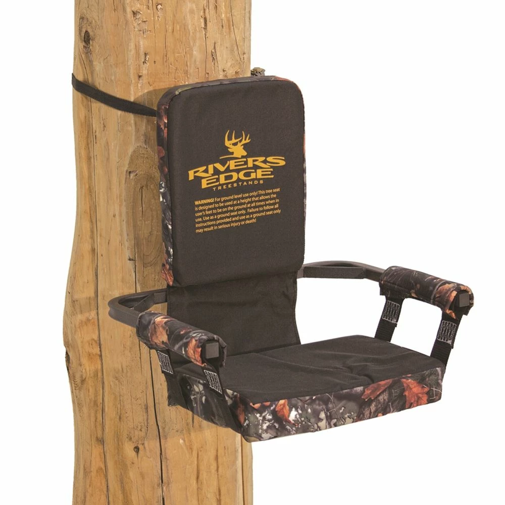 Rivers Edge® Lounger Seat quickly and easily attaches to the tree with a strong 1 in. polyester ratchet strap. This design allows you to place on the tree at a desired height (For ground level use only; both feet must be able to touch the ground during use!) It provides ultimate all-day comfort with it's extra thick 3 in. foam padded camo seat, backrest, and armrests.