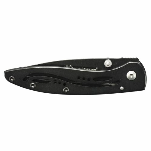 Smith & Wesson Frame Lock Folding Pocket Knife has a black 7Cr17 high carbon stainless steel drop point blade with ambidextrous thumb knobs and jimping. The handle is black stainless steel.